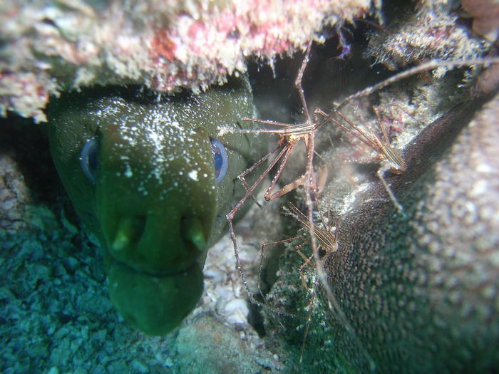 Grüne Moräne - Panamic green moray - (Gymnothorax castaneus) mit Garnelen / with shrimps