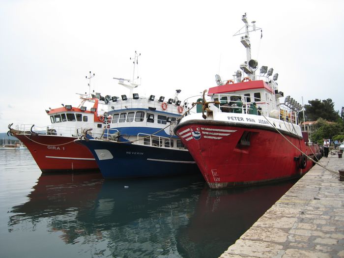 Drei Fischfänger im Hafen