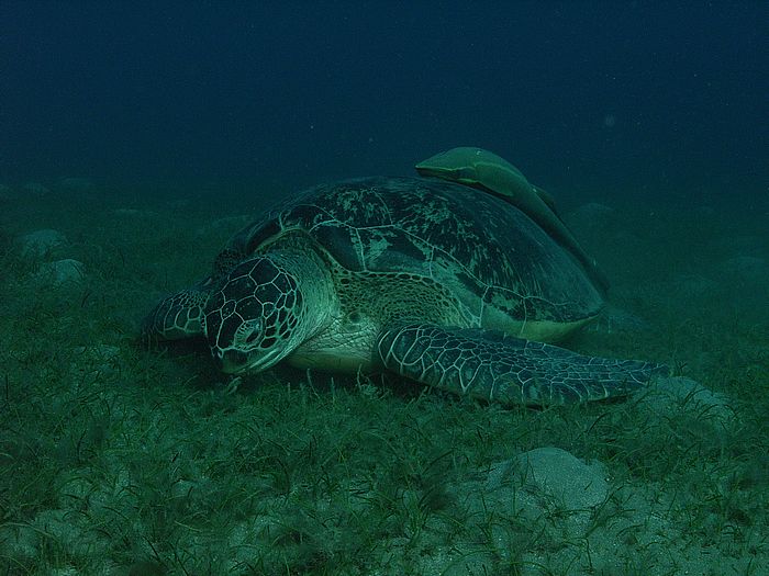 Chelonia mydas - Grüne Schildkröte mit Echeneis naucrates - Schiffshalter