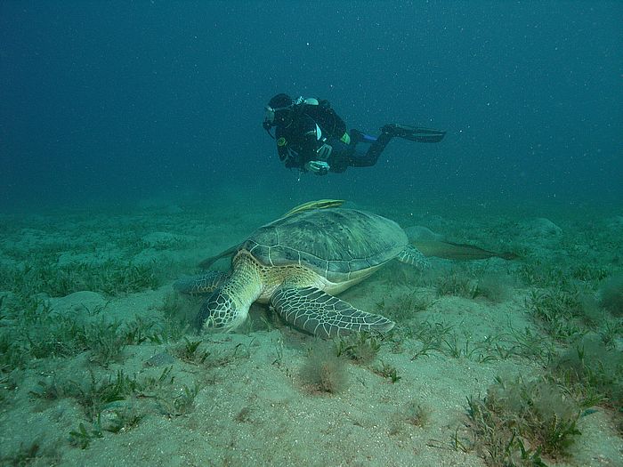 Chelonia mydas - Grüne Schildkröte mit Echeneis naucrates - Schiffshalter und Taucher Juliane Gierth