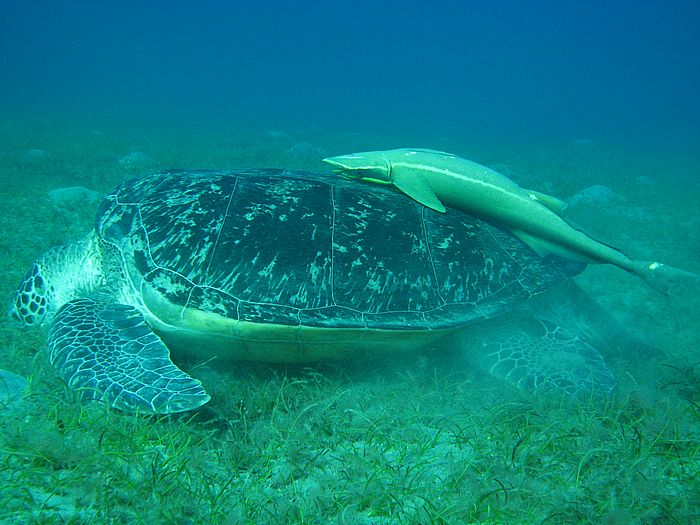Chelonia mydas - Grüne Schildkröte mit Echeneis naucrates - Schiffshalter
