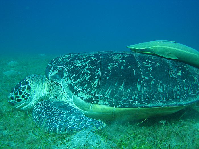 Chelonia mydas - Grüne Schildkröte mit Echeneis naucrates - Schiffshalter