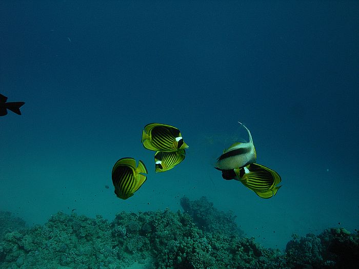 Falterfische und Wimpelfische verspeisen eine Qualle